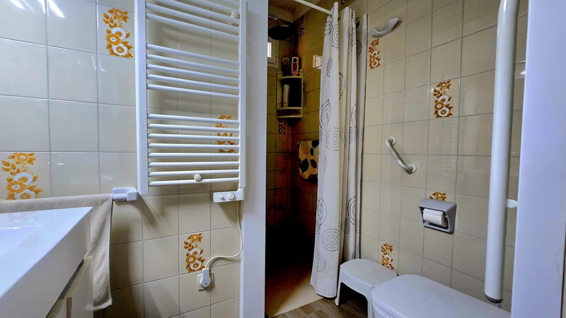 Ground Floor (57 m²): A cozy private garden welcomes you. Inside, you’ll find a spacious living room, a dining room, a separate, fully equipped kitchen, a full bathroom with a walk-in shower, and a courtyard with a large laundry room and a storage room. The house has two entry doors; the second provides direct access to the courtyard.